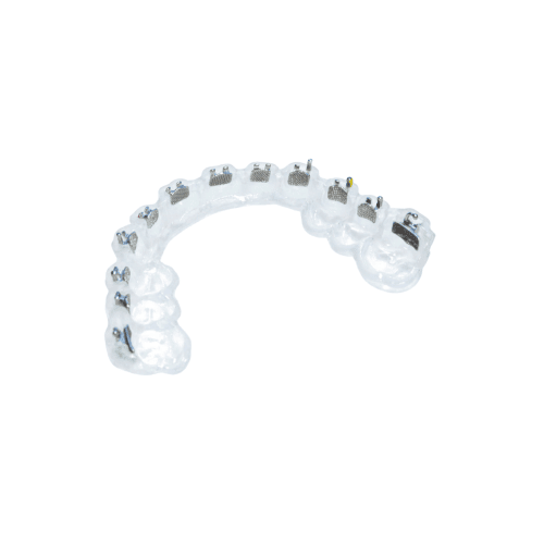 Bandejas de transferencia de brackets diseñadas por ordenador e impresas en 3D con resina flexible.