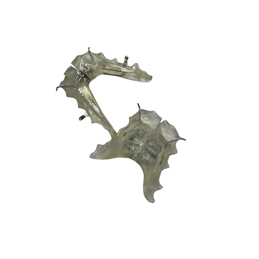 Placa con arco y ganchos Adams. Se utiliza como retención post tratamiento de ortodoncia.