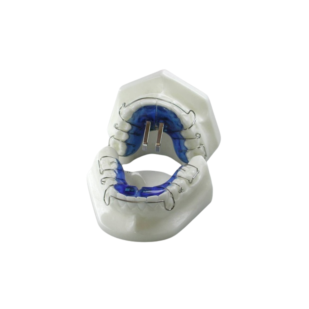 Placa acrílica con tornillo de expansión. Se utiliza para realizar expansión maxilar o mandibular.